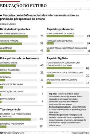 Em outubro, o jornal O Estado de São Paulo divulgou uma pesquisa realizada pela Fundação Catar que indica os valores, as habilidades, os tipos de currículo, as fontes de conhecimento e os papéis do educador que serão mais valorizados daqui a 15 anos. Cerca de 650 especialistas em todo mundo foram ouvidos para a projeção desse cenário. Os resultados apontam para formas de aprender que promovam o movimento autônomo e que considerem as singularidades de cada educando.