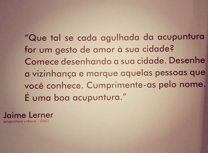 Outro nome que tem somado muito a essa discussão é o do arquiteto e urbanista Jaime Lerner, famoso pelas obras de Curitiba e por implantações de suas criações no mundo todo. No seu livro “Acupuntura Urbana”, ele usa a técnica milenar como metáfora da nossa possibilidade de exercer uma atuação transformadora onde quer que estejamos, derrubando alguns muros entre a vida tão exclusivamente privada e a integração benéfica com o meio.